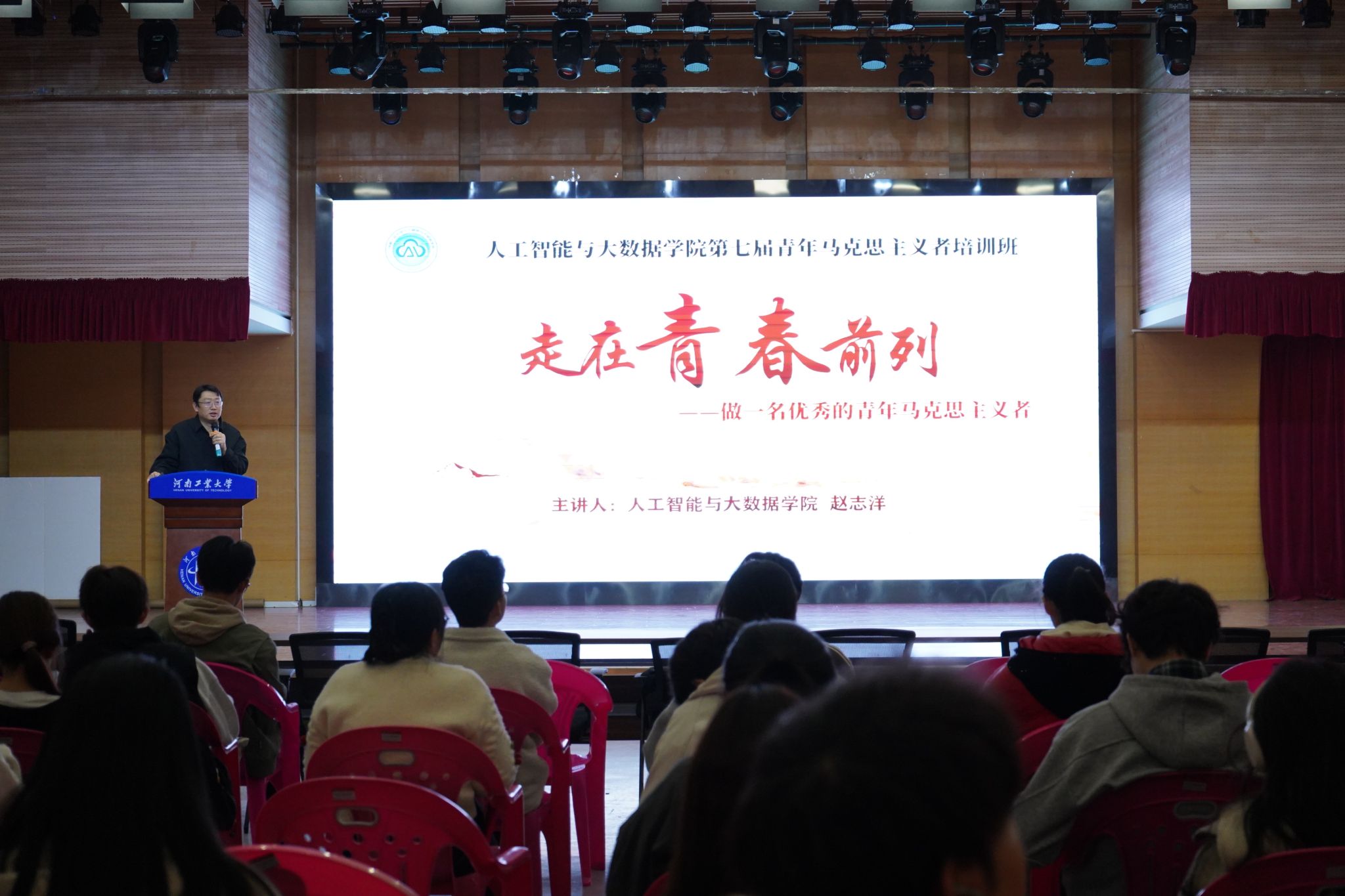 学生代表大会结束后,党委副书记赵志洋以《做新时代坚定的青年马克思主义者》为题展开了“青马工程”团学骨干培训班第一讲。他强调新时代青年要筑牢信仰之基、深化理论武装、坚持知行合一。结合人工智能技术迅猛发展的时代背景,他鼓励学生要将专业学习与社会实践深度融合,在服务社会与同学中增长才干,在民族复兴赛道上奋勇争先。
