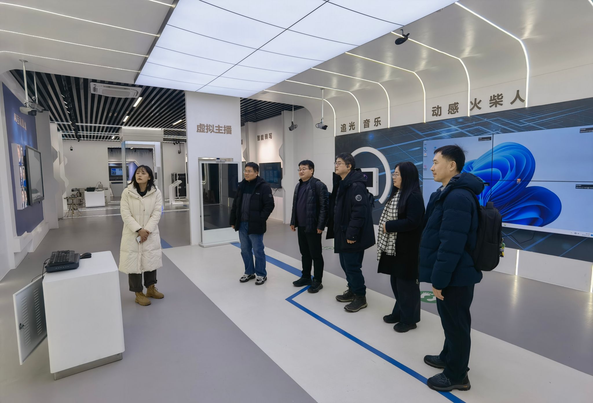 人工智能认知厅。科大讯飞代表王丛丛担任讲解员,通过生动详实的讲解和现场演示,详细介绍了各平台的建设理念、硬件设施、功能定位及在教学科研、人才培养中的应用成效。
