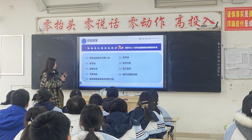 积极动员2025年国家奖学金、国家励志奖学金、国家助学金获得者,担任“学生资助宣传大使”,回到家乡、回到母校,结合自身在国家资助政策的帮助下安心学习、健康成长的亲身经历,向在读高中生及其家长全方位宣讲资助政策,将“不让一名学生因家庭经济困难而失学”的郑重承诺传递给每一位追梦少年。