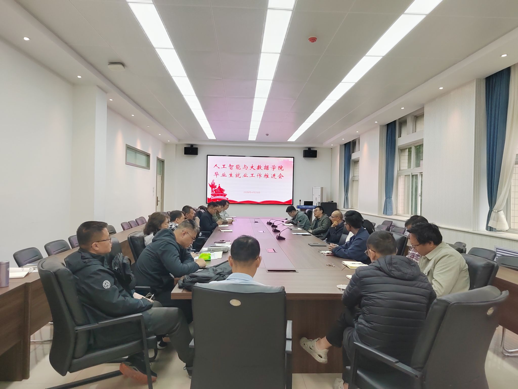 于6369会议室召开2026届毕业生就业工作推进会,全面总结考研情况,部署下一阶段就业推荐、重点帮扶等任务。学院领导、各系主任、毕业班班主任及全体辅导员参会。