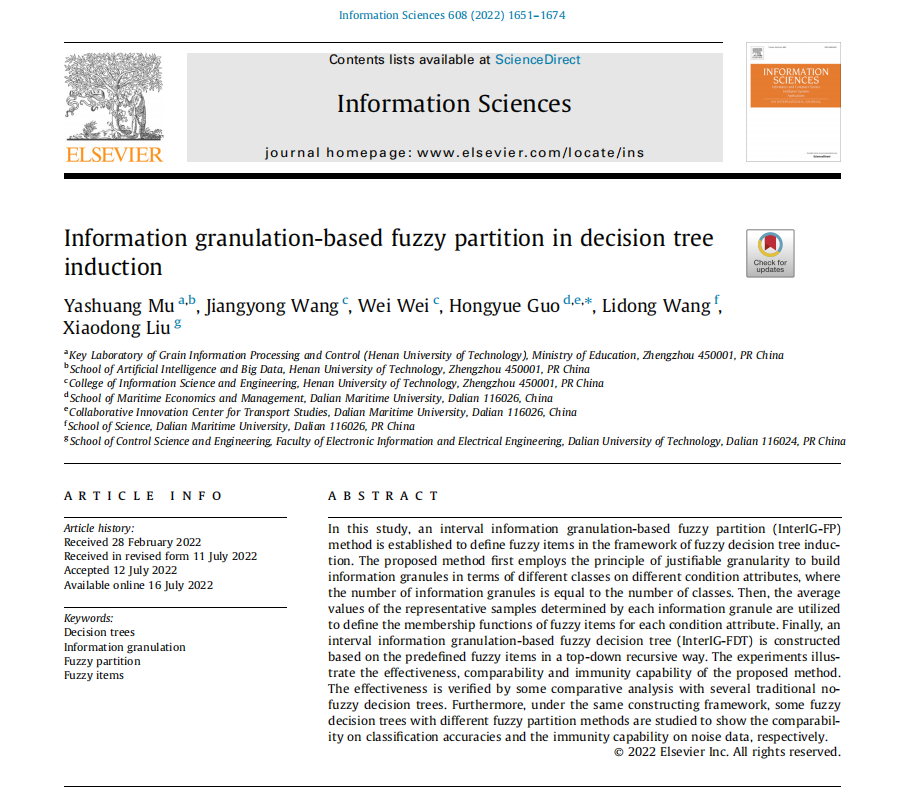 近日 ,我院高级机器学习与应用团队成员母亚双博士在国际高水平学术期刊Information Sciences (中科院一区,Top, IF=8.1)上发表了题为“Information granulation-based fuzzy partition in decision tree induction”(DOI: 10.1016/j.ins.2022.07.055)的研究论文,该成果是基于区间信息粒化的模糊划分方法研究的阶段成果,yanetfix