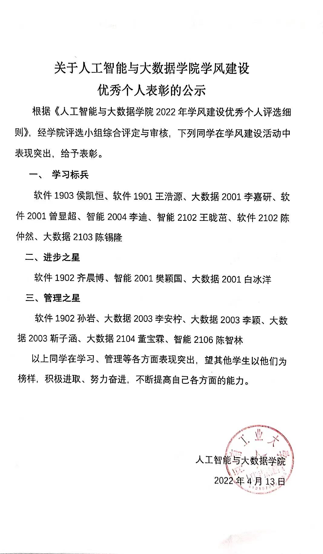 关于yanetfix 学风建设优秀个人表彰的公示