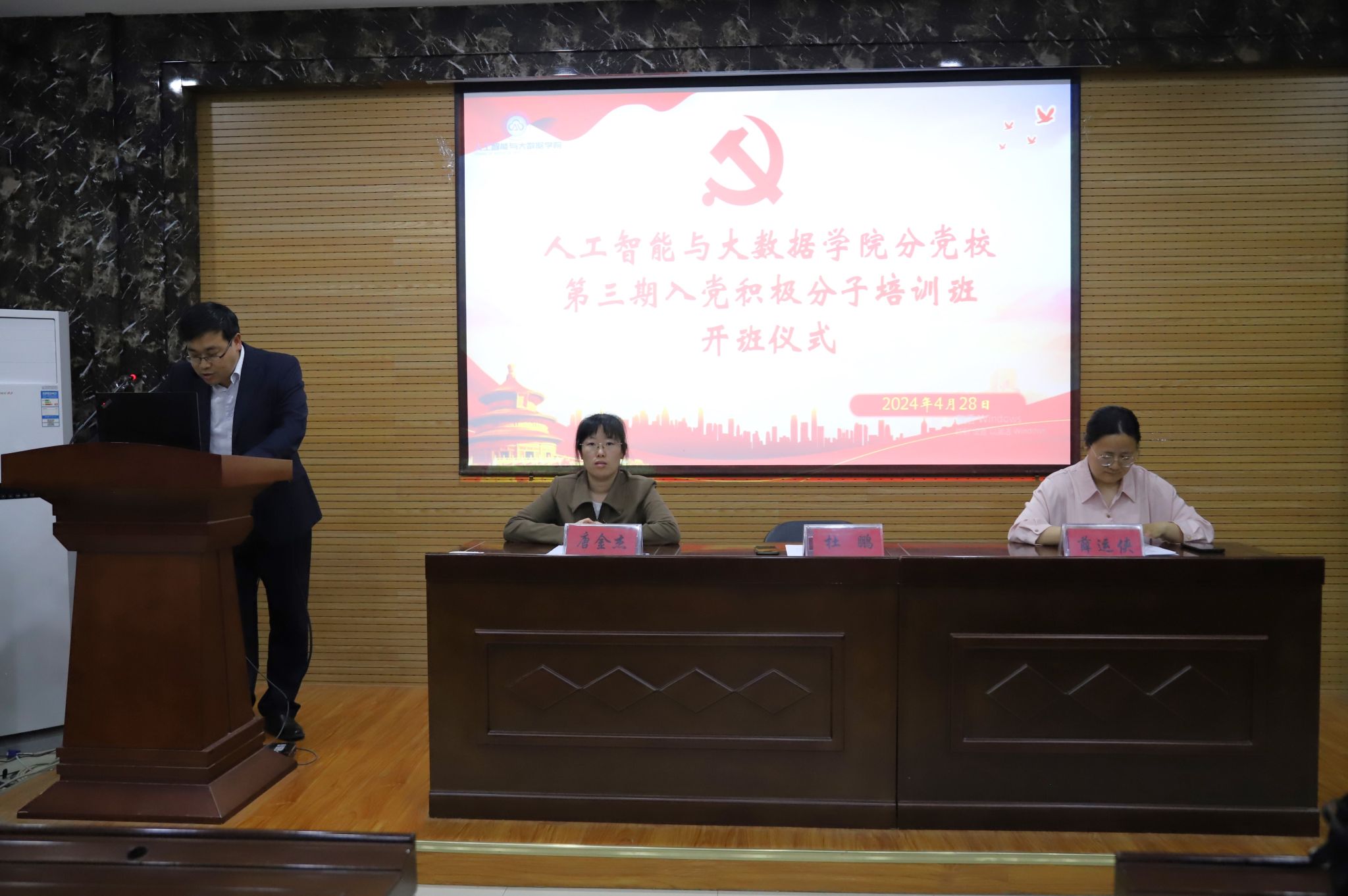 在6228会议室举办第三期入党积极分子培训班开班典礼。学院党委书记杜鹏、副书记薛运侠、学生党支部书记代表唐金杰、全体辅导员及本期入党积极分子参加了此次开班典礼。本次典礼由院团委副书记郑帅主持。