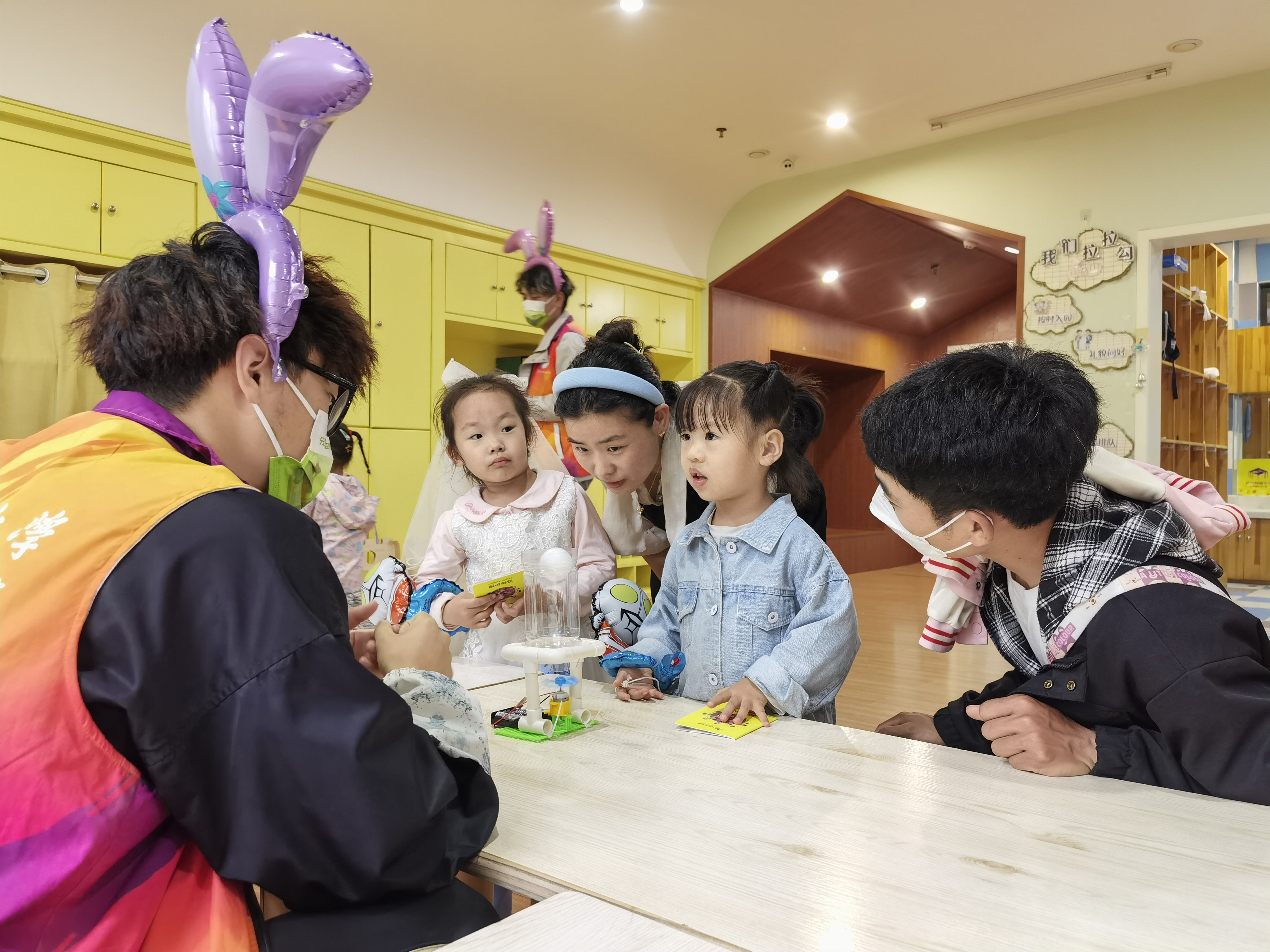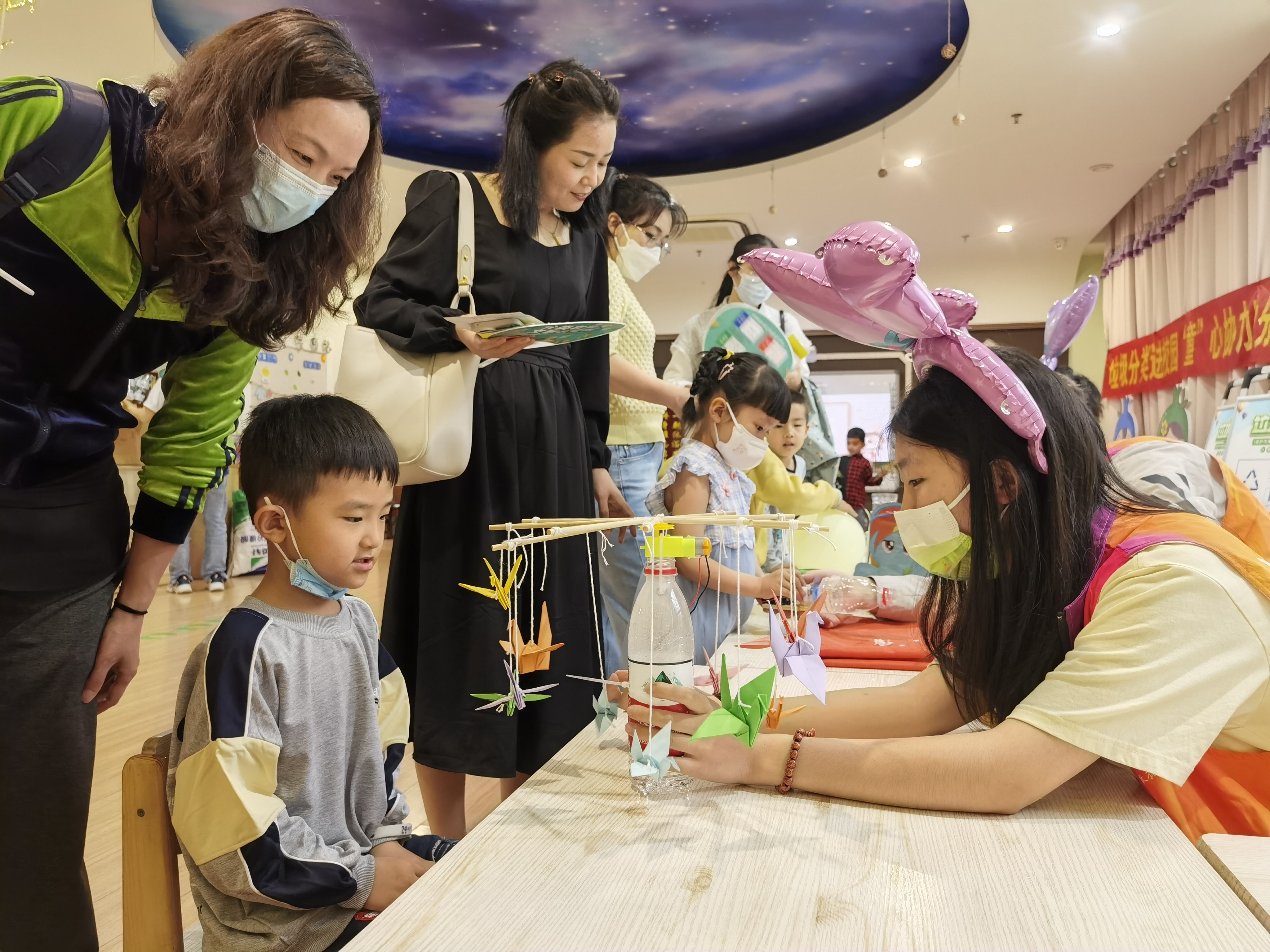 活动前夕,志愿者们提前用废弃物品制作好“吸尘器”、“旋转木马”、“悬浮小球”、“饮水机”等手工作品,并为小朋友们讲解制作方法,让孩子们学会如何废物利用、变废为宝。接着,志愿者利用小卡片和垃圾桶,带领小朋友们学习了垃圾的主要种类,使小朋友们更加直观地学到了垃圾分类的知识。使小朋友、家长认识到资源浪费对环境的危害和垃圾分类的重要性,让孩子们养成从身边小事做起,为环保贡献自己的力量。