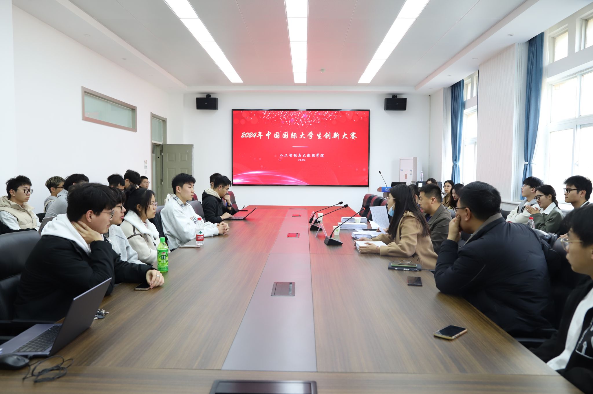 在6369会议室举办中国国际大学生创新大赛院赛。比赛特邀中国青年创业导师王伟、学校就业创业中心创业指导科科长徐鹏飞担任评委,院党委副书记薛运侠、学工办副主任陈鸣凘、参赛团队指导老师和团队成员以及部分感兴趣的同学到场参加本次比赛。