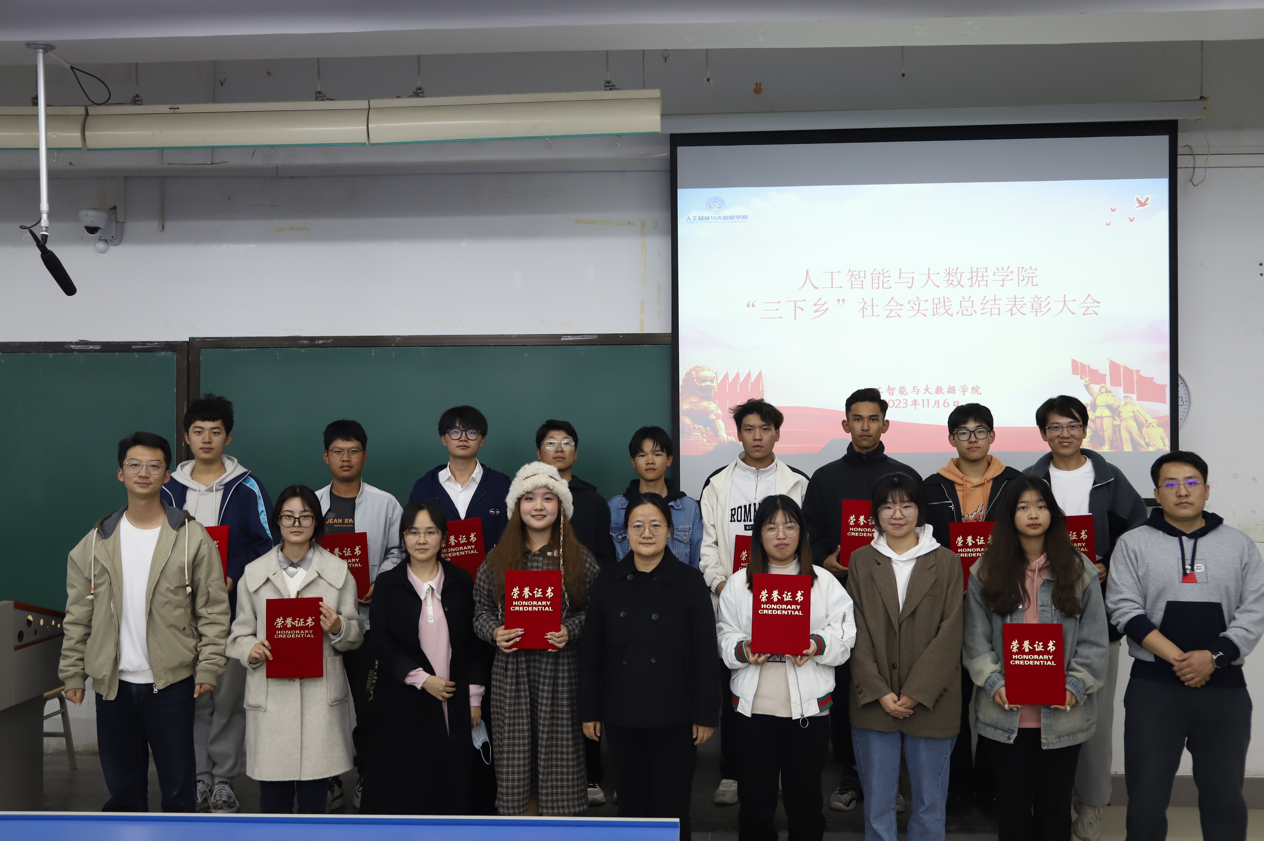 最后,学院老师为在社会实践中表现优异的团队颁发证书并合影留念。