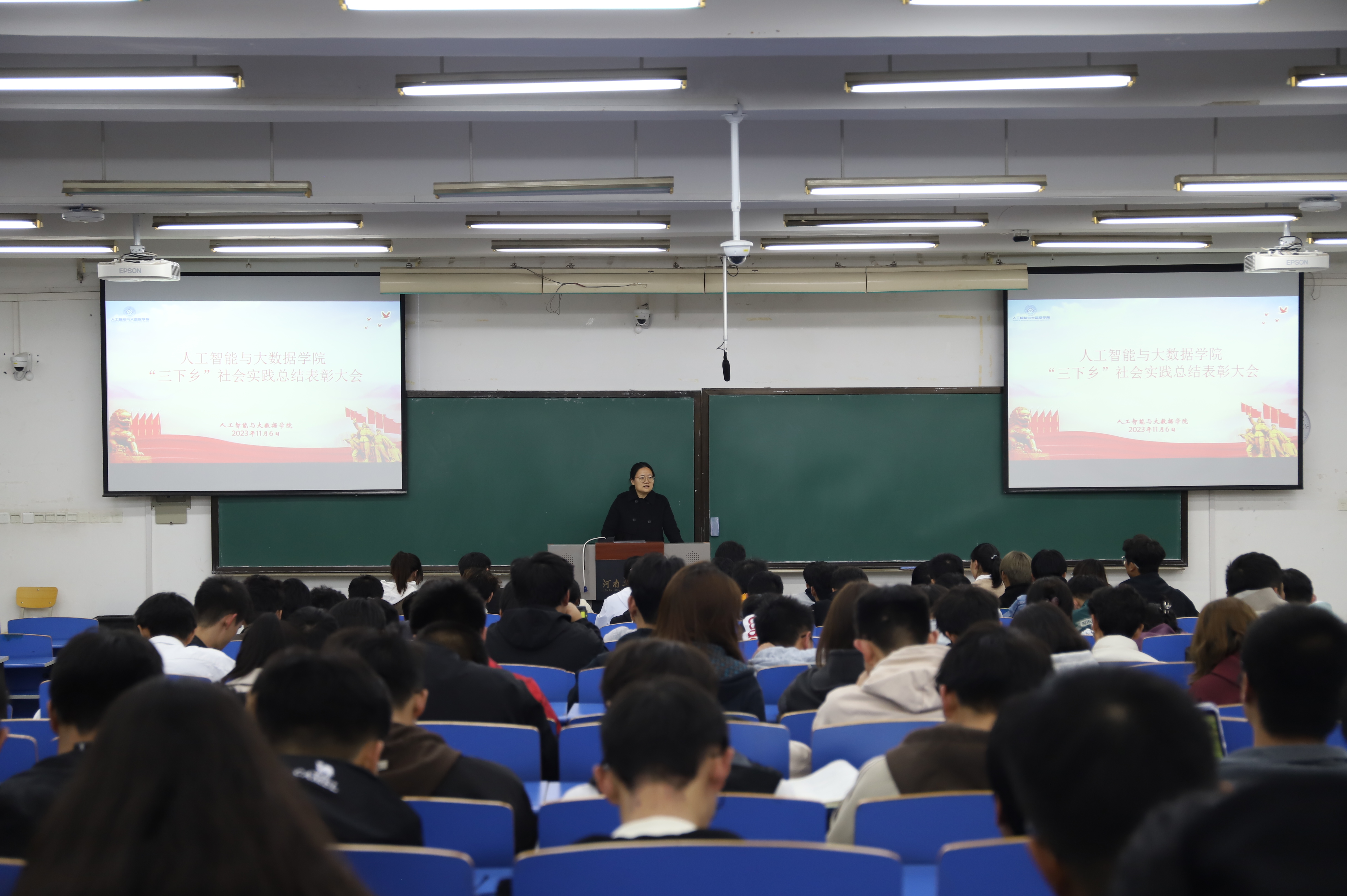 在4322教室召开暑期社会实践评审表彰大会。学院党委副书记薛运侠、团委副书记郑帅、全体辅导员、团委学生会骨干、2022级暑期社会实践成员及2023级学生代表参加会议。