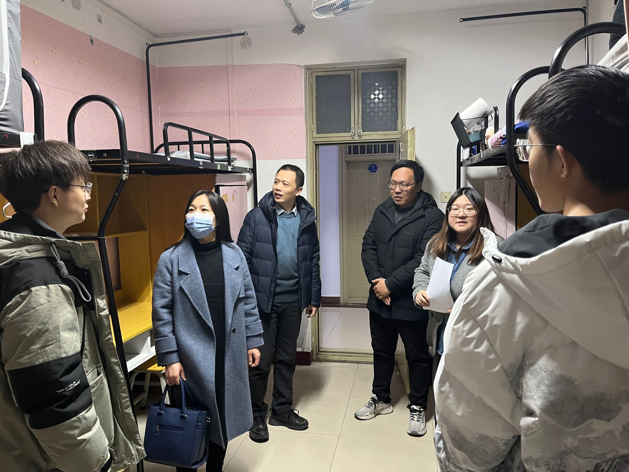 党委书记杜鹏、院长樊超、党委副书记薛运侠、副院长赵玉娟以及全体辅导员前往学院学生宿舍进行走访,在第一时间了解学生返校情况、身心健康及思想动态,为同学们送去温暖、关怀以及新学期的美好期待。