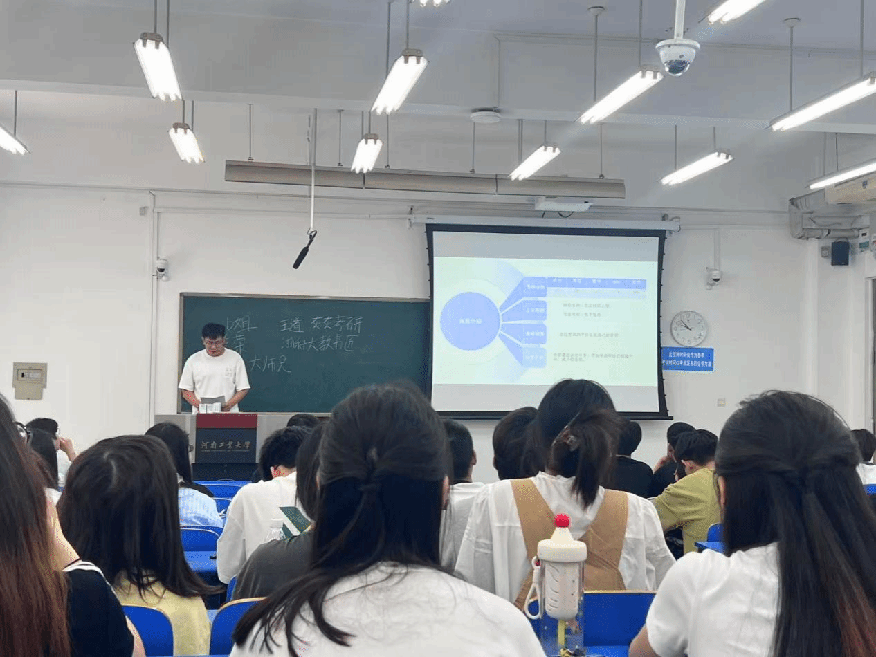 于5月14日在博学楼211室举办Al成长攻略之考研经验分享会。本次会议邀请了2025届考研已拟录取的学生代表进行分享交流,学院党委副书记赵志洋、全体辅导员、2026届有意向考研的学生参加了本次活动。