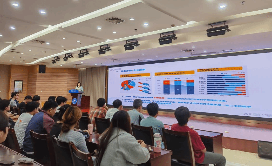 邀请科大讯飞高级人力资源总监齐慧,在D205学术报告厅为学院学子带来了一场主题为“‘码’上启航,职通未来”的专题就业讲座。学院党委副书记赵志洋、全体辅导员共同参加了活动。讲座由赵志洋主持。